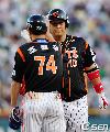[OSEN=잠실,이대선 기자] 3일 '2011 롯데카드 프로야구' LG 트윈스와 롯데 자이언츠의 경기가 잠실야구장에서 열렸다. 5회초 1사 2루 롯데 이대호가 1타점 적시타를 치고 조원우 코치와 하이파이브를 하고 있다. / sunday@osen.co.kr